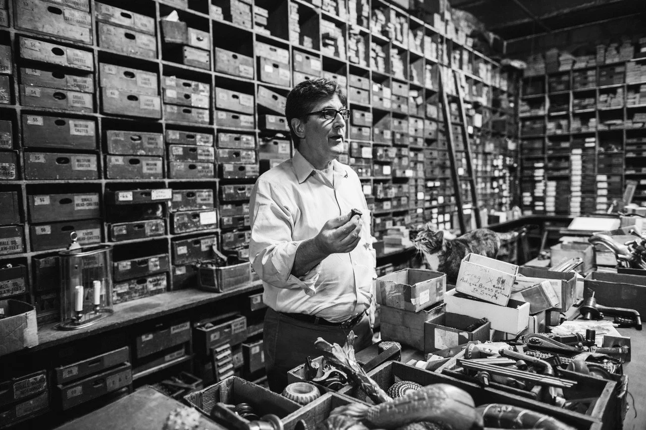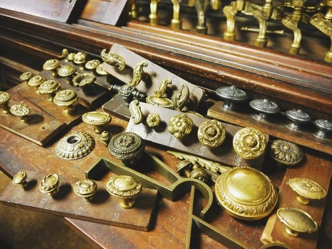 Packed from floor to ceiling with nearly 100,000 pieces: doorknobs, faucets, hinges, latches, relief sculptures, and more. The sample room feels like stepping inside a living museum of craftsmanship. Every shelf and drawer told a story in brass and bronze.